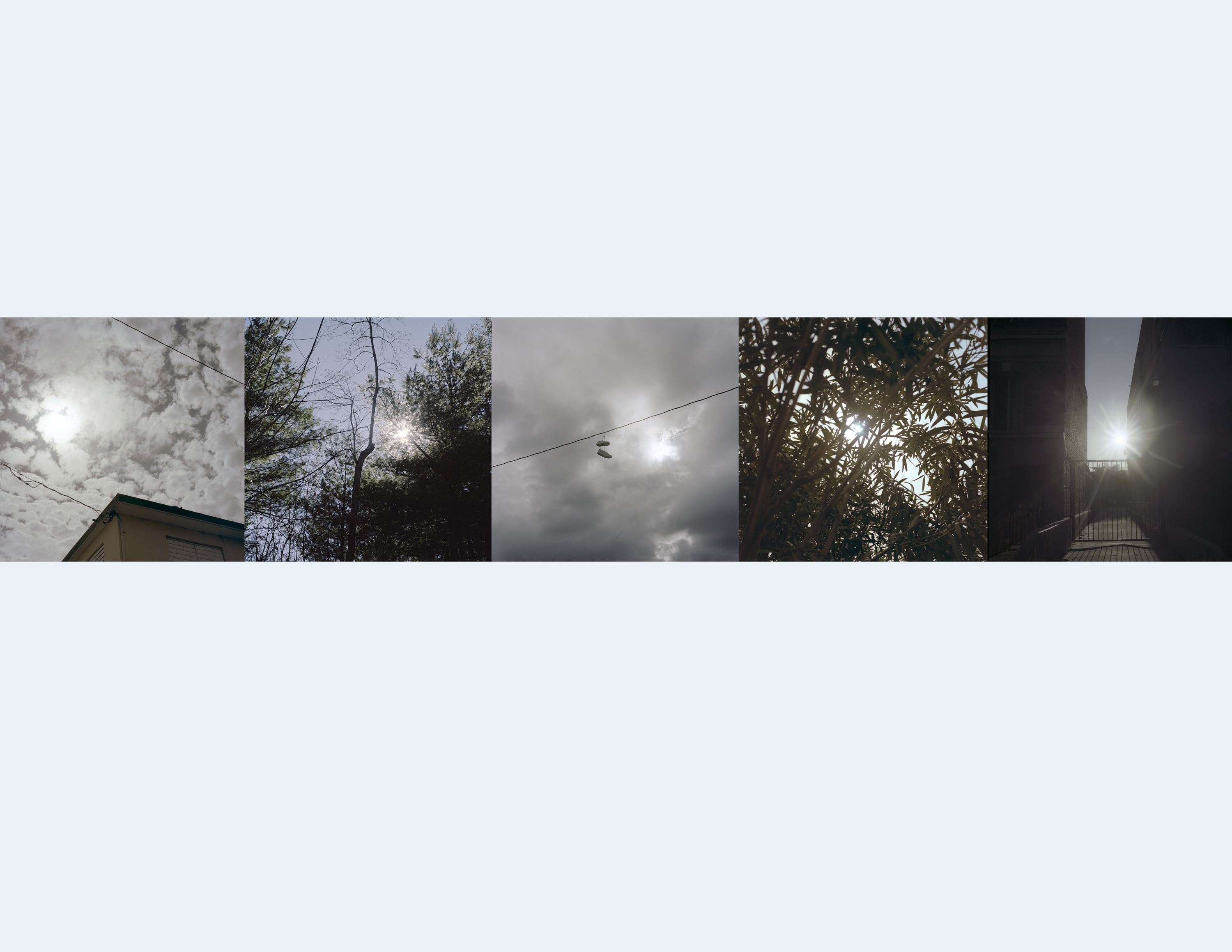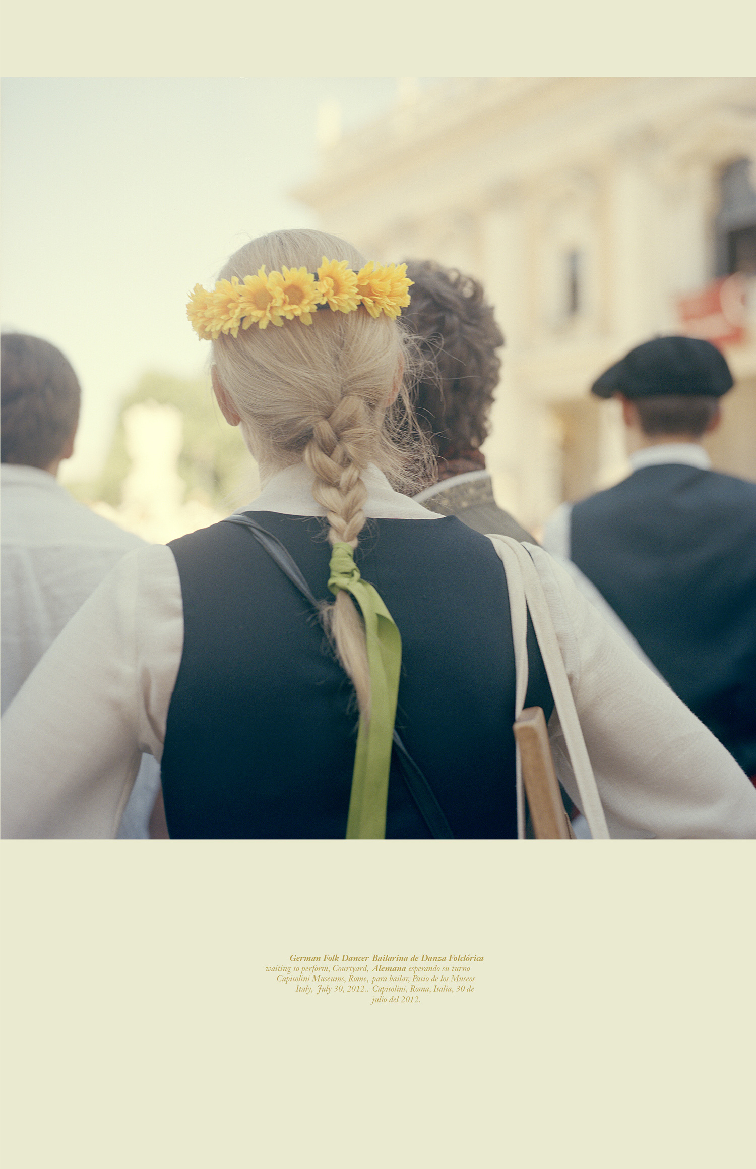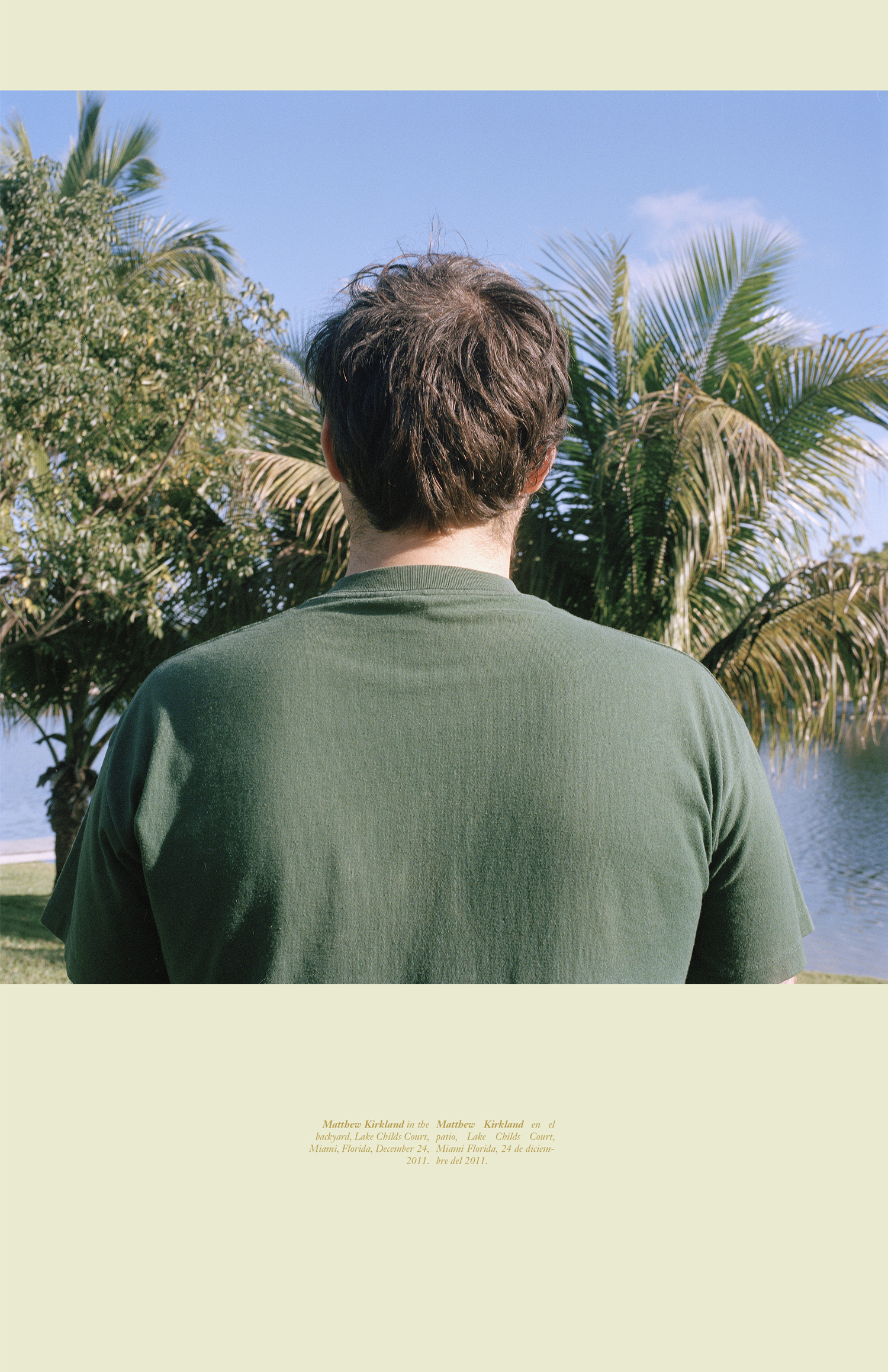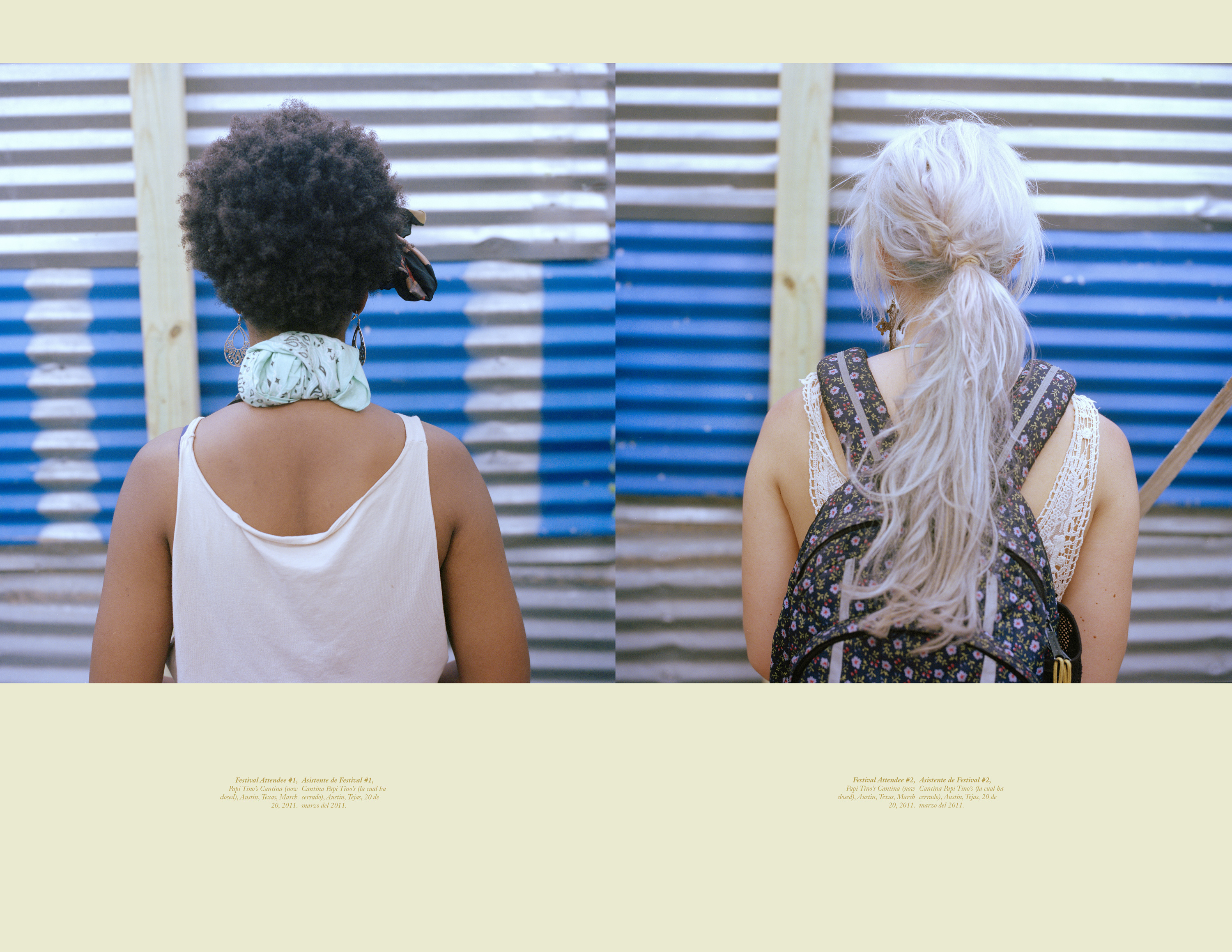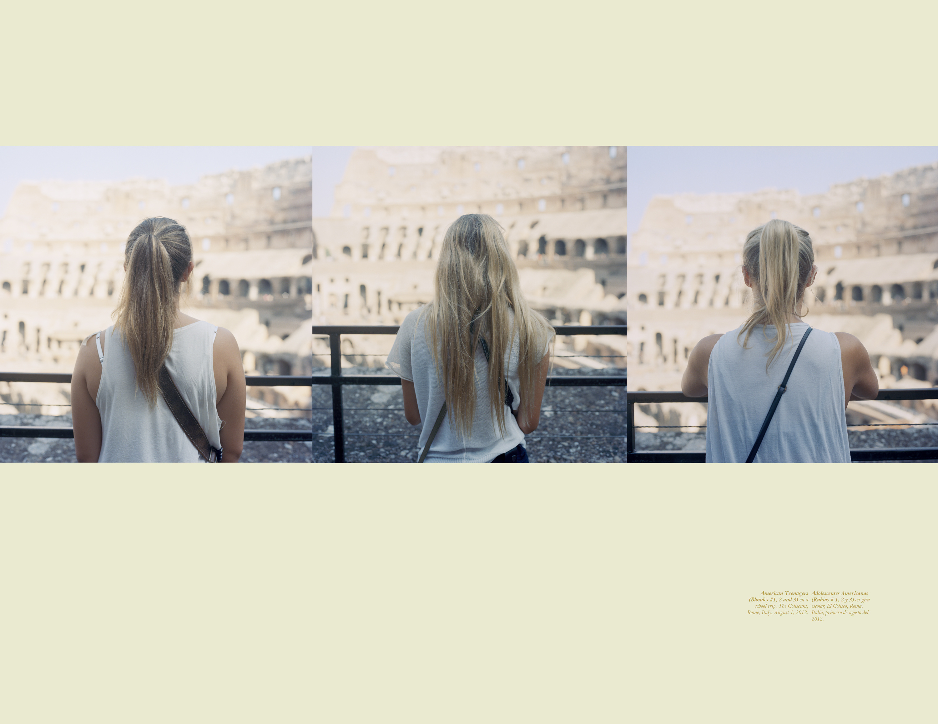 3.Vol. 1 The first completed tome of E.I./I.E.is the result of four years of photographing nothing. I don’t mean that I wasn’t photographing; rather I brought my camera with me everywhere, and, with no expectations of what I wanted to picture, I made images. As the years mounted, I began to self-organize my archive of nothings, noticing that certain themes – such as ‘backs of heads’ – kept surfacing. Over time this collection of formally strange portraits (a word I use cautiously, as they refuse The Face) both impart and deny critical visual data and thereby began to reflect back the selective aims of the project itself. The information given below the photograph – written in English and Spanish – describe all the notes I can remember around the picture making and ‘supplement’ the missing face. When that series ends, a new one begins, borrowing its organizing principle from the last image of the preceding group. Sometimes their relationship is obvious while at other times they're a challenge to suss out. The subsequent series are also labeled bilingually, though not always in the same way. For example, the 2nd and 4th entries in Vol 1. (1b + 1d) are titled, in both English and Spanish, as only the westernmost and easternmost places photographed (Sitka, Alaska -> Nice, France / Sitka, Alaska -> Niza, Francia, for example). Each individual image is then titled using the coordinates of the location where the photo was made lending both specificity to and distance from the information. Meanwhile the 3rd set in the series, made of images shot directly aimed at the sun, provide only one sentence, Sunrise Sunset Amanecer Alborada, at the beginning of the series. The play on geologic time that follows is left to the viewer to figure out. These shifts, not just from English to Spanish but also in the level of detail and subjectivity in the information provided, reflect not only my own bilingual upbringing but also the multifacetedness of the subjective encounter.